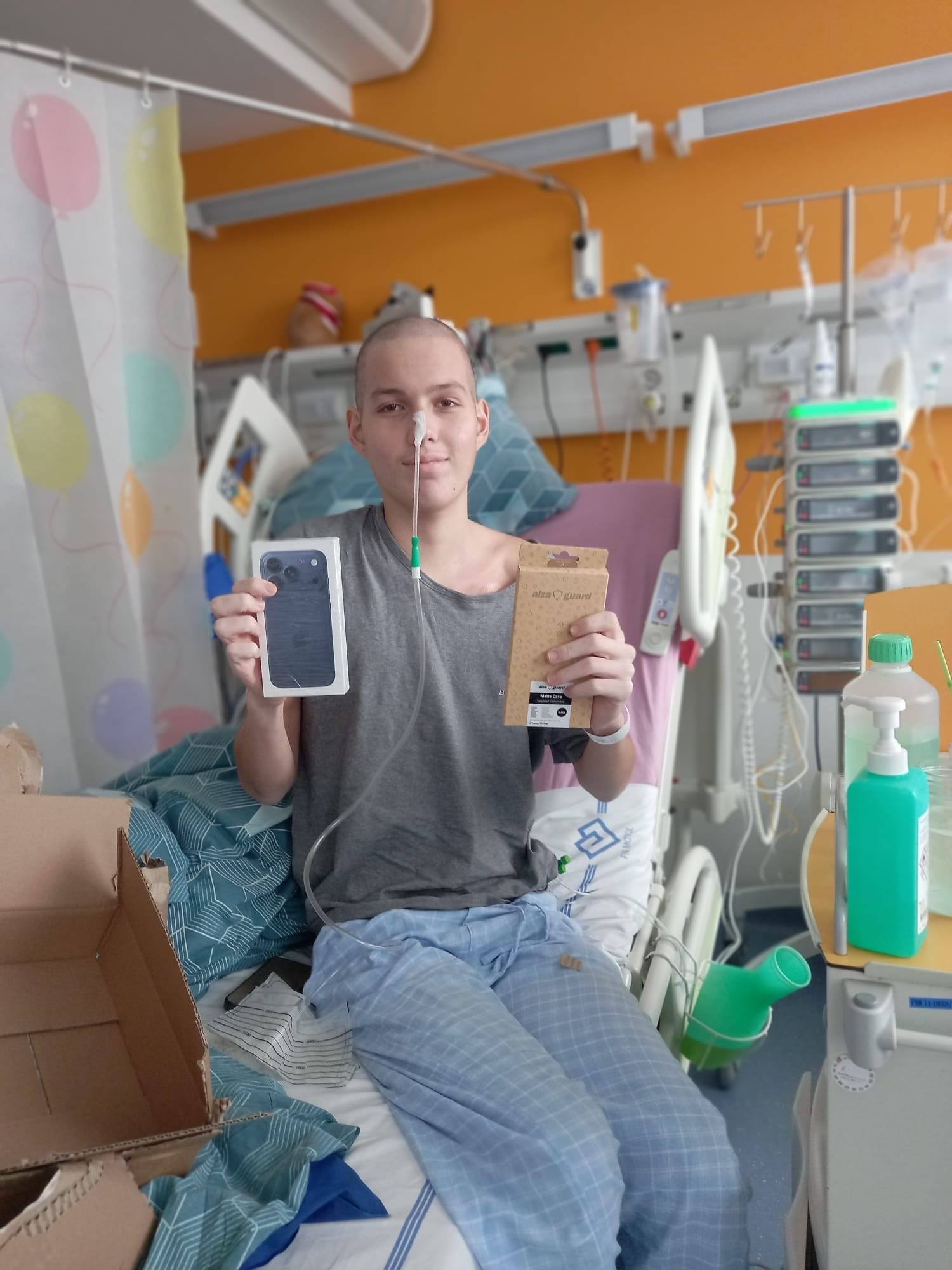 Moc si přál telefon, IPHONE. Párkrát jsme se viděli a zase se uvidíme. Zatím mi ale poslal fotku a poděkování Vám všem. Hned jsem mu volala zpátky. Telefon zvedla maminka, protože Šíma teď mluvit nemůže – má sondu, nemůže jíst ani mluvit. Byl na operaci, praskl mu vřed a zároveň mu stále kape chemoterapie.